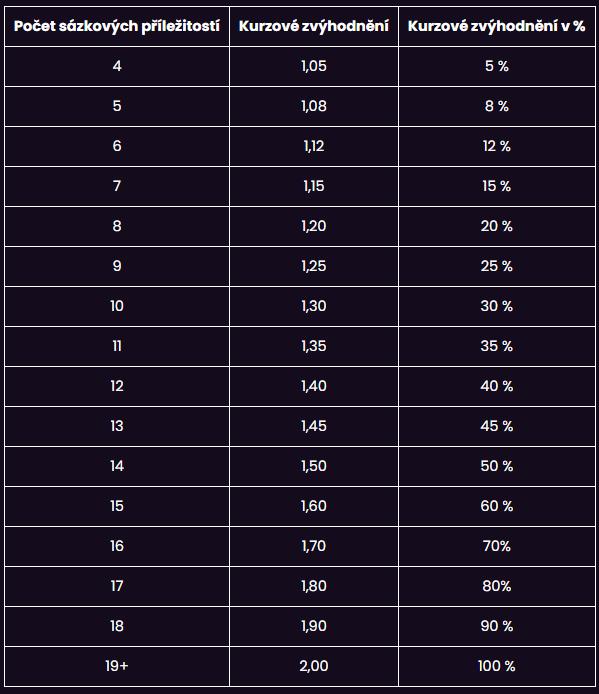 1.5 Kursové zvýhodnění dle těchto pravidel bude vždy uplatněno pouze na ty sázkové příležitosti obsažené na tiketu, které splňují parametry stanovené v těchto pravidlech.1.6 Do počtu sázkových příležitostí obsažených na tiketu nebudou započítány takové sázkové příležitosti, u kterých již bylo uplatněno jakékoliv jiné kursové zvýhodnění poskytnuté provozovatelem (např. sázkové příležitosti z kategorie navýšených kursů, kursové zvýhodnění poskytnuté provozovatelem v rámci jiné propagační akce).